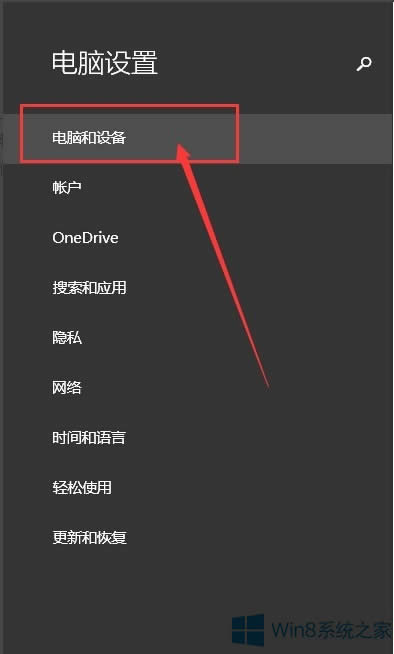 3、进入设置以后,点击选择“电脑和设备”,这个是最关键的。