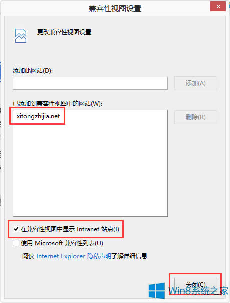 3、这时添加的网站就会出现在“已添加的网站列表中”,将下方的“在兼容性视图中显示”勾选上,最后点击下方的关闭即可。