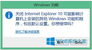 4、将上面对话框中的“Internet Explorer 10”选项中的对钩去掉,在弹出的对话框中点击“是”选项。