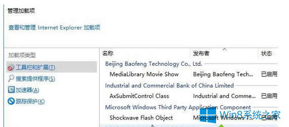 2、打开“工具”—“查看加载项”,点击左侧的“工具栏和扩展”,在“显示”下反选择“所有加载项”,发现右侧没有“Flash Player”的加载项;