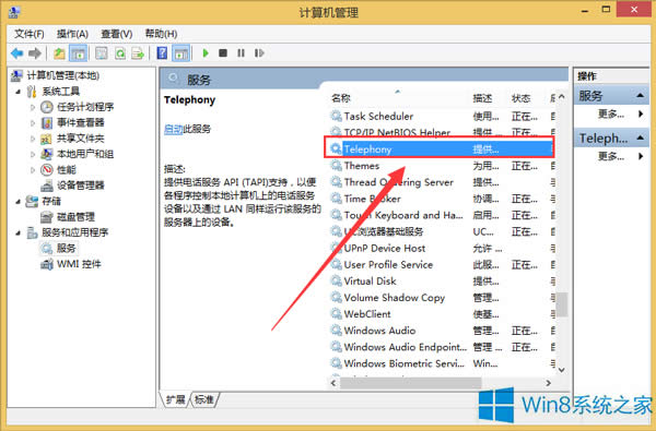 4、好了,现在你就打开了计算机的所有服务。拖动右边的滚动条,找到一项叫做电话服务的,双击它。如下图: