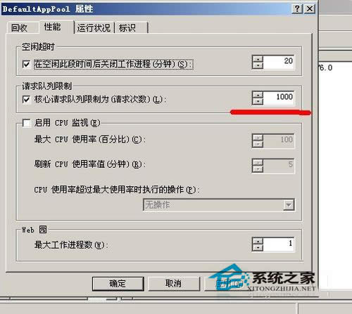 2、如果没有关闭应用程序池,那就要看看是否请求到达时应用程序池队列已满。每个网站都有其最大的负载量,当访问请求达到这个值的时候就会出现503错误,解决办法可以加大请求队列,默认值为1000。