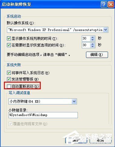 3、在系统失败选项下将“自动重新启动”的复选框去掉,然后一路单击“确定”按钮使设置生效。