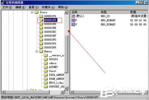 12、为什么要看这个类型,因为还要删除另一个注册表项,可以看到图中Users下面的键值有个名为000001F5的,他对应的就是Guest用户,如图所示: