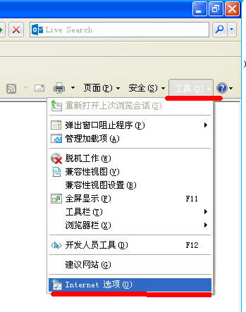 1、打开浏览器,点最上面一排里的“工具”,点“Internet选项”;