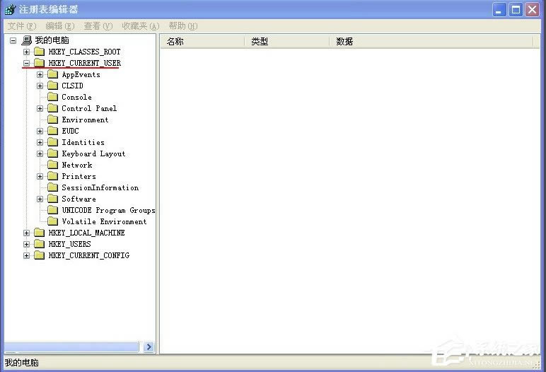 3、我们在注册表编辑器中找到:HKEY_CURRENT_USER并展开。