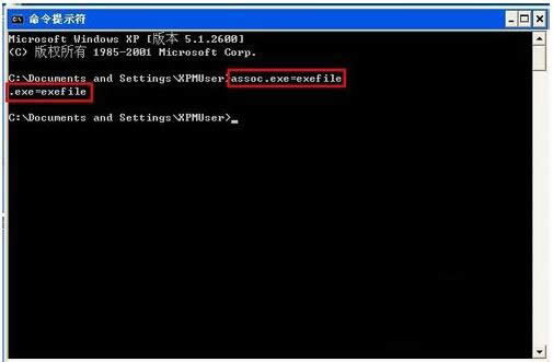 3、在打开的命令提示符窗口中键入“assoc.exe=exefile”命令并按回车键即可恢复exe文件的关联。