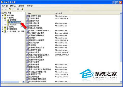 3、选择“本地安全策略”——“本地策略”——“用户权利指派”;